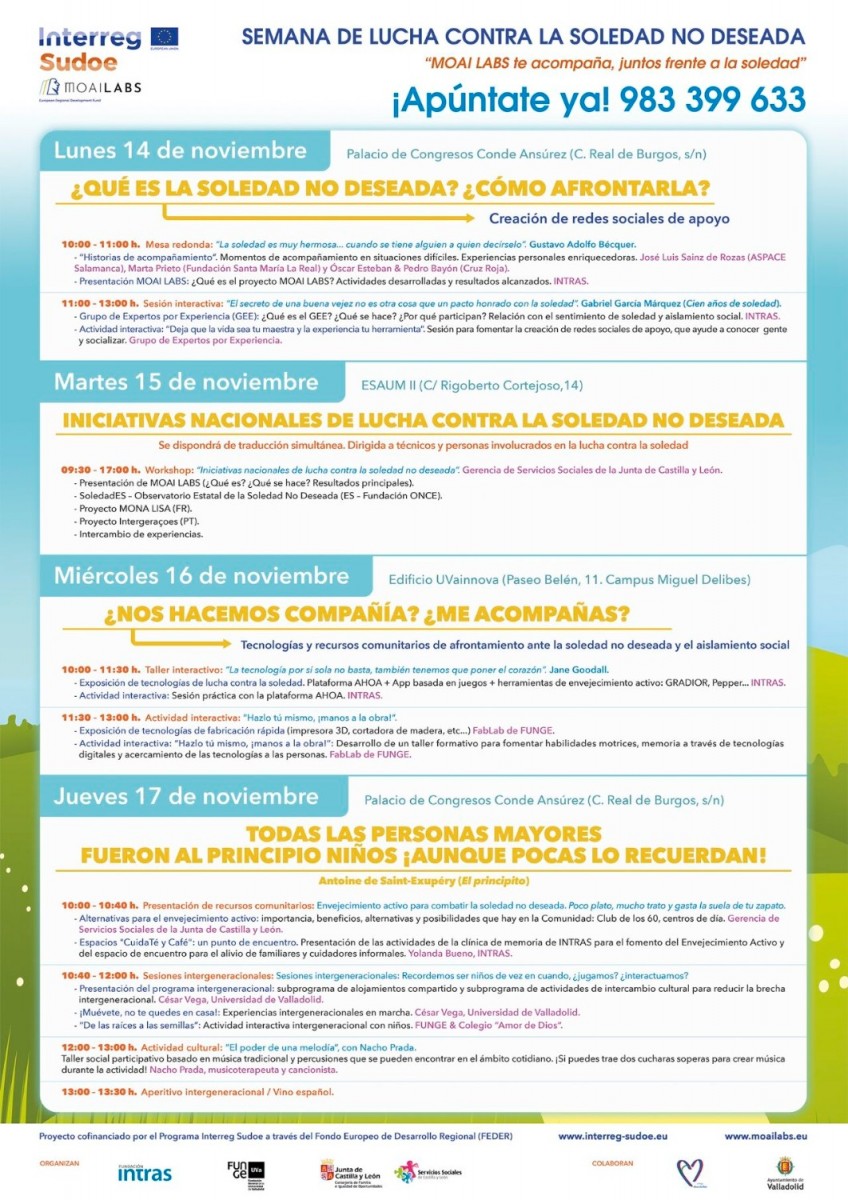 Del 14 al 17 de noviembre, en el marco del proyecto Interreg Sudoe Programme, MOAI LABS ha preparado un montón de actividades, talleres gratuitos y muchas sorpresas dentro de la Semana de lucha contra la soledad no deseada en Valladolid. https://lnkd.in/dGgp7GUA