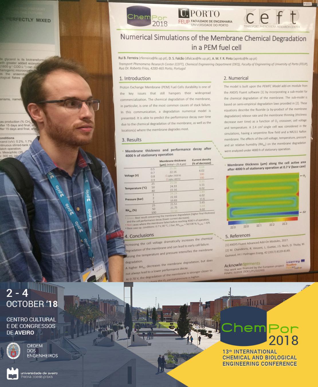 La Universidad de O Porto participó en la decimotercera edición de la conferencia internacional sobre ingeniería química y biológica “Chempor” que tuvo lugar en Aveiro (Portugal) en otoño 2018. Rui Ferreira presentó el trabajo sobre “simultaneidades numéricas de la degradación química de membranas en combustible PEM”, desarrollado bajo el proyecto PEMFC-SUDOE.