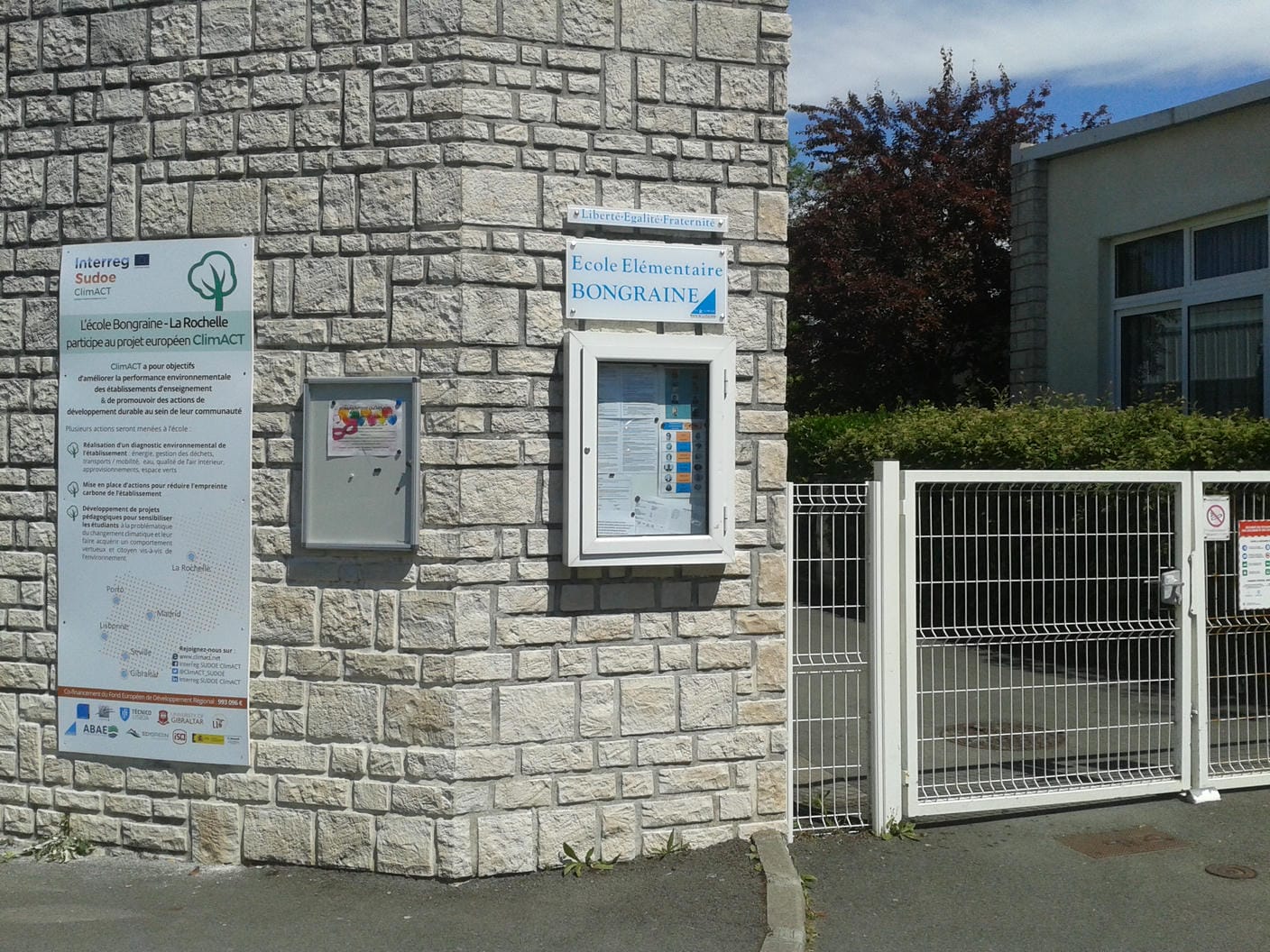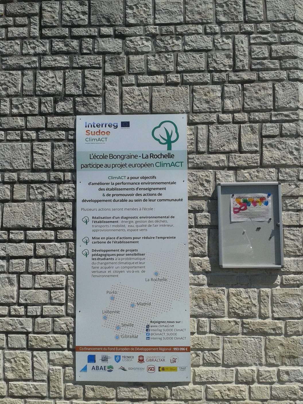 En el marco del proyecto CLIMACT, la ciudad de La Rochelle y la Universidad de La Rochelle, ambas beneficiarias del proyecto, han decidido “ocupar” espacios educativos, instalando paneles promocionales a la entrada de 6 escuelas primarias, dos institutos y una universidad. Dicha iniciativa tiene por objetivo sensibilizar a los padres y jóvenes adultos acerca de las problemáticas tratadas por CLIMACT y las acciones de los Comités escolares para la economía baja en carbono. Las instalaciones permanecerán in situ durante todo el proyecto.