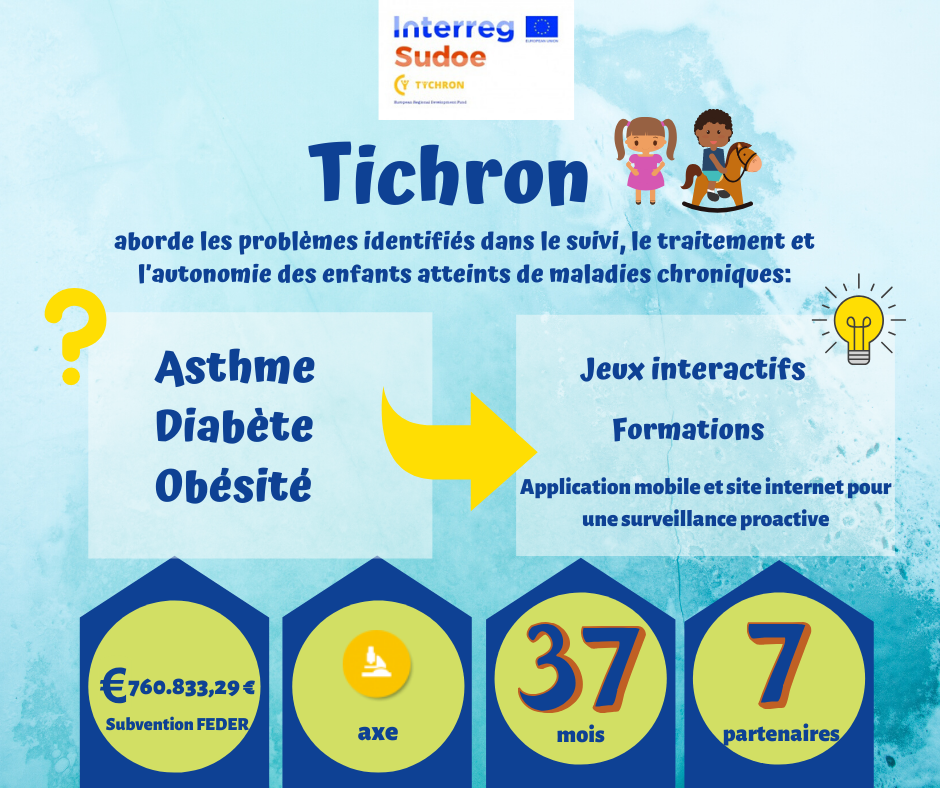 La région SUDOE, en particulier la France, le Portugal et l'Espagne, dispose de services de santé offrant des possibilités d'amélioration, principalement en ce qui concerne la prise en charge des enfants atteints de maladies chroniques, dans lesquels une liste de besoins et d'exigences se pose. , tant par les professionnels de santé que par les patients et leur environnement. Avec son consortium pluridisciplinaire, le projet permet aux régions de la zone SUDOE de disposer de solutions optimales de suivi des patients chroniques dès l'enfance.