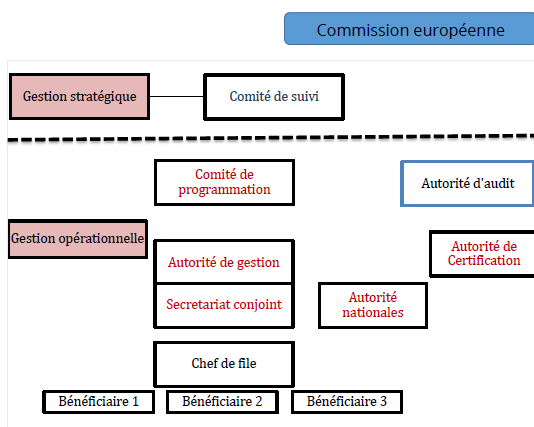 Le Programme Interreg V-B Sudoe est géré par des organes de types stratégiques et opérationnelles. Ci-dessous, vous trouverez un schéma dans lequel sont indiquées les instances de gestion du programme et leurs relations avec les entités bénéficiaires des projets approuvés dans le cadre du Programme.