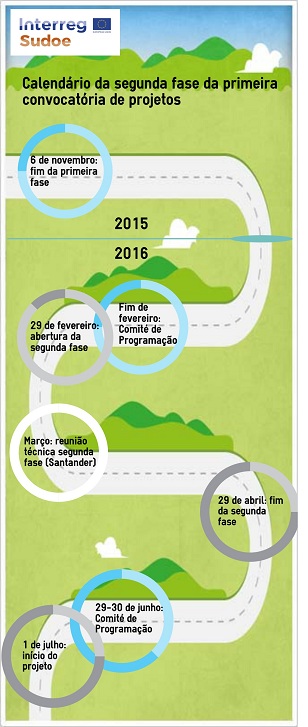 Uma vez finalizada a primeira fase da primeira convocatória de projetos, o Programa Interreg Sudoe estabeleceu as datas-chave do calendário da segunda fase, que será aberta desde o dia 29 de fevereiro ao dia 29 de abril de 2016. O objetivo é que os projetos possam começar a sua atividade dia 1 de julho de 2016.