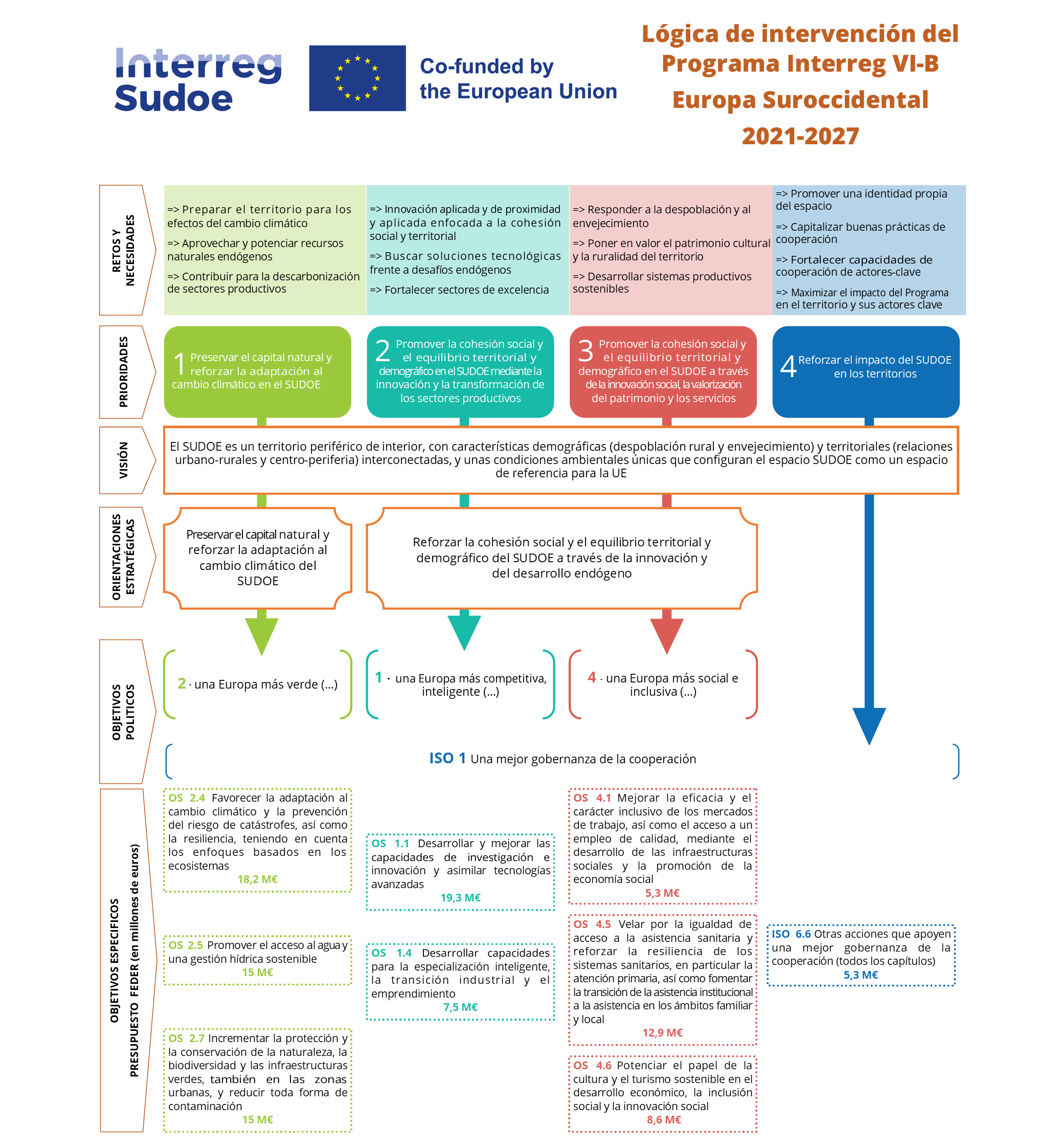 Puede acceder al programa así como a una presentación más detallada de la lógica de intervención de Interreg Sudoe 2021-2027 a través de los siguientes enlaces: